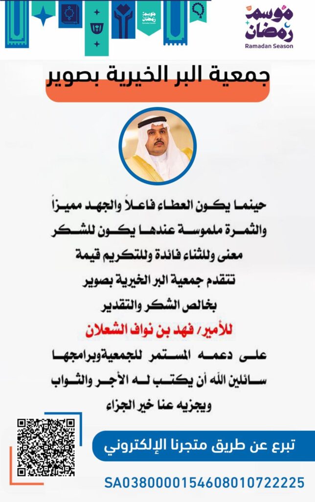 تتقدم جمعية البر الخيرية بصوير ببالغ الشكر والعرفان للأمير فهد بن نواف الشعلان على تبرعه الكريم لصالح الجمعية لعام 2023م. هذا ونسأل الله أن يجعل كل ما قدمه للرفع من مستوى هذه الجمعية في موازين حسناته وأن ينفعه بها يوم لا ينفع مال ولا بنون إلا من أتى الله بقلب سليم